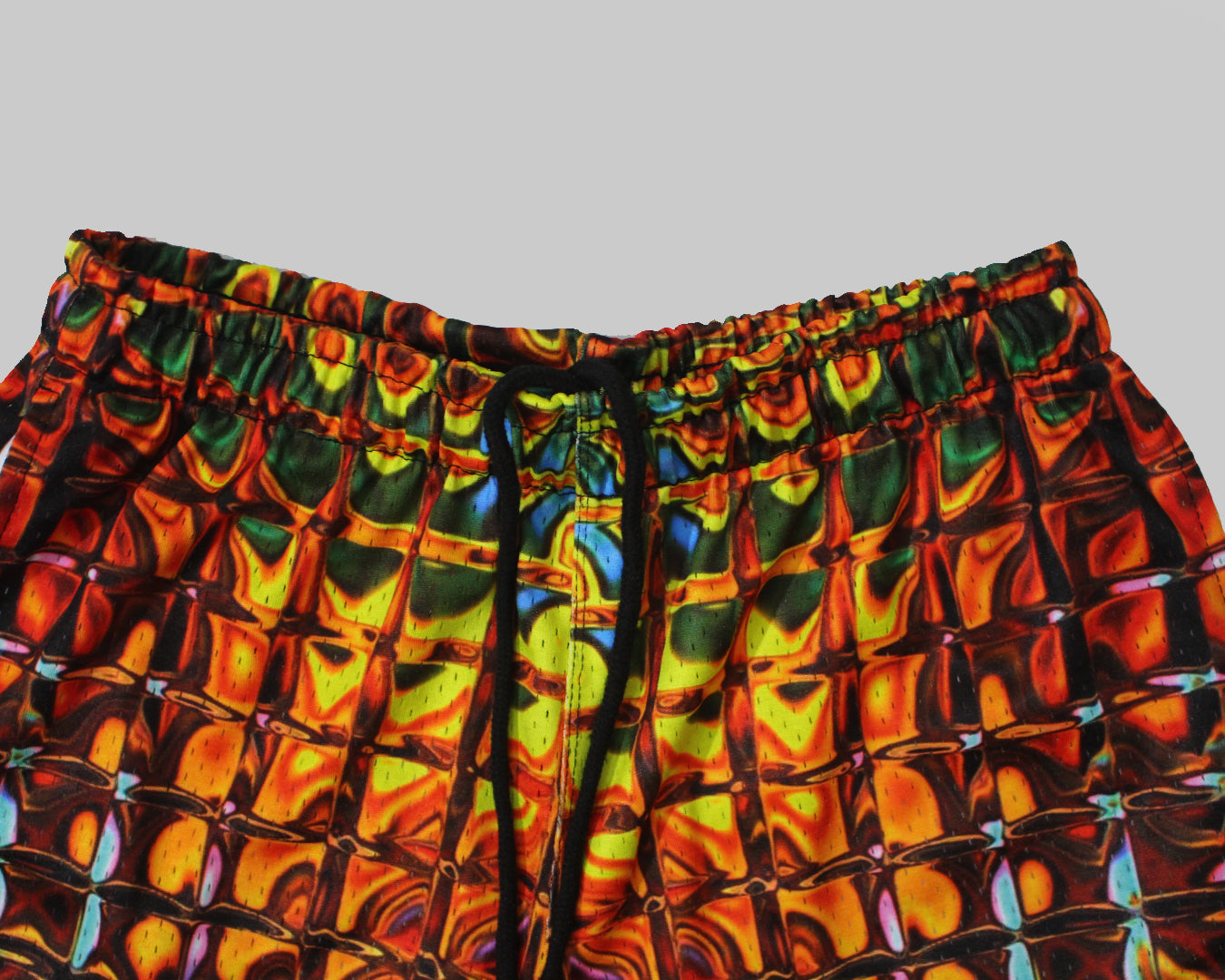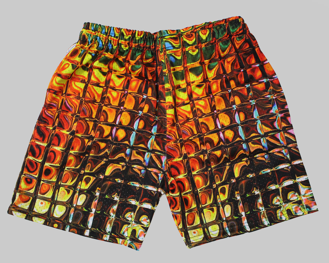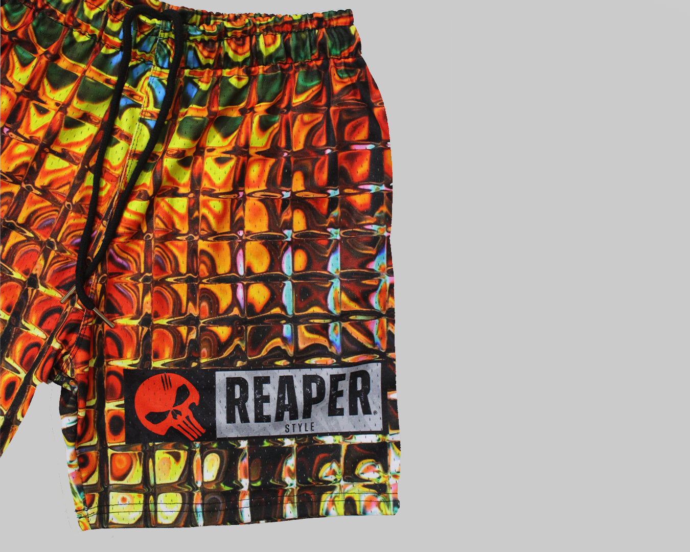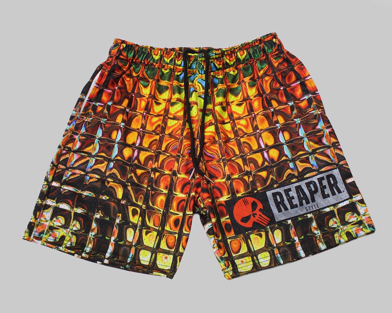 Bring the heat with these Reaper Style Glass Pattern Shorts. Featuring a vibrant, fiery mosaic print that looks like stained glass in motion, these mesh shorts offer eye-catching color.