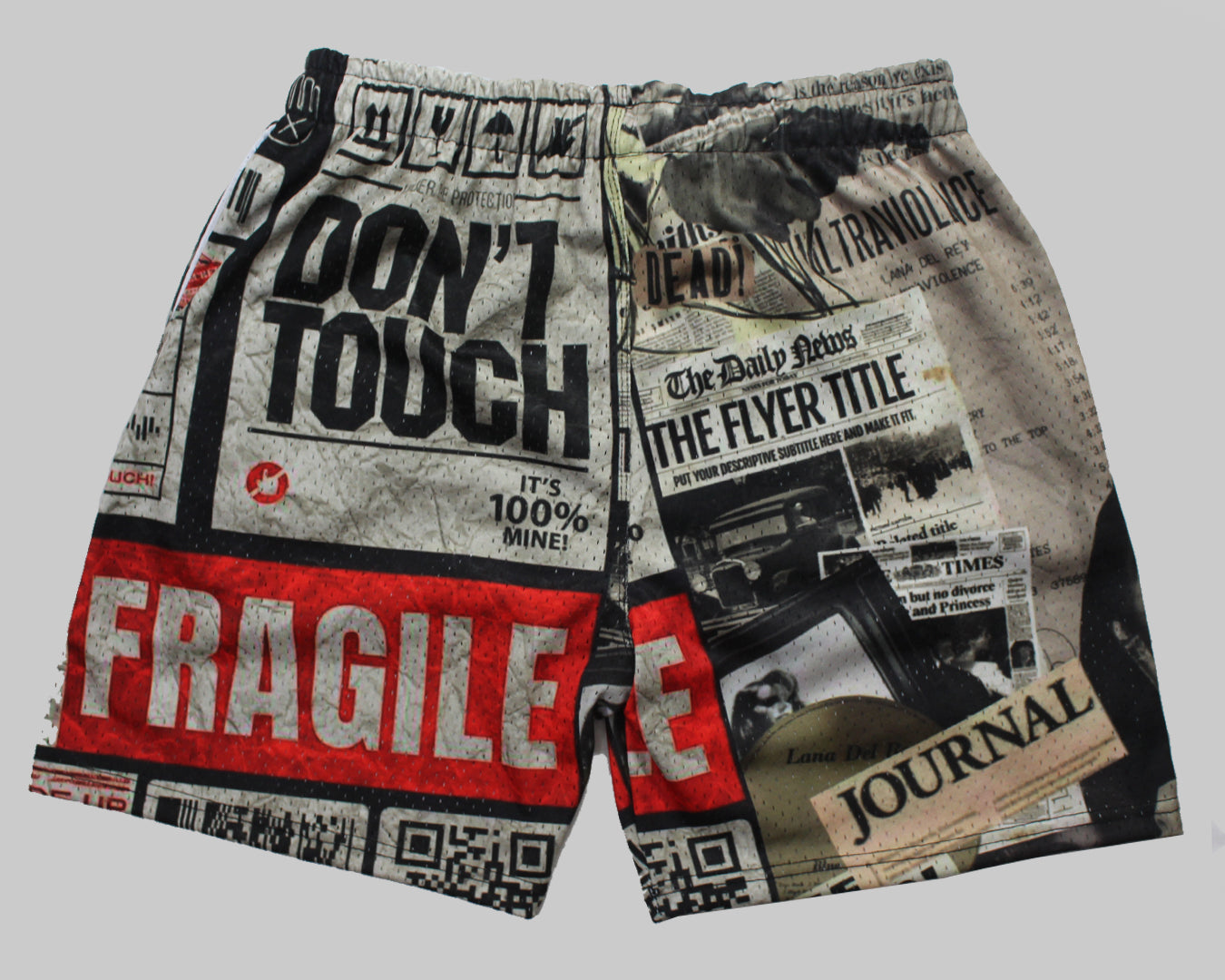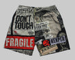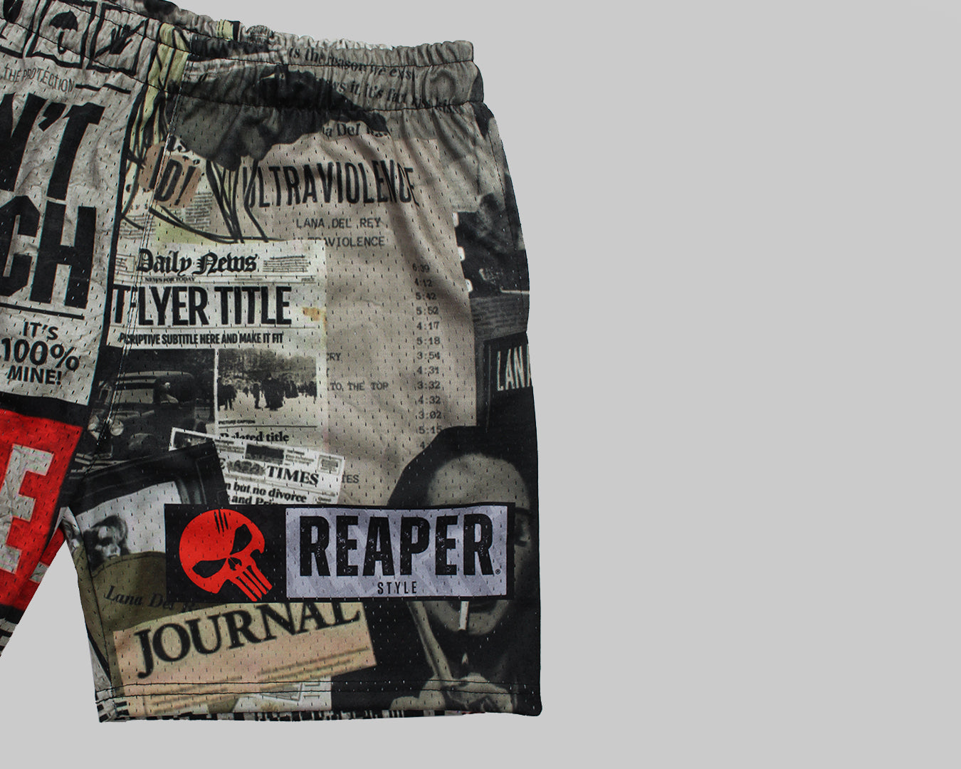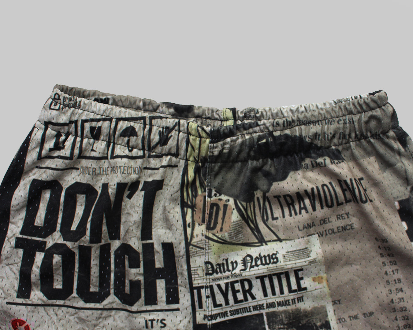 Make headlines with the Reaper Style “Don’t Touch” Shorts — a bold mix of newspaper clippings, warning labels, and edgy street graphics. These eye-catching mesh shorts deliver serious attitude and standout style, built for those who move loud and proud.