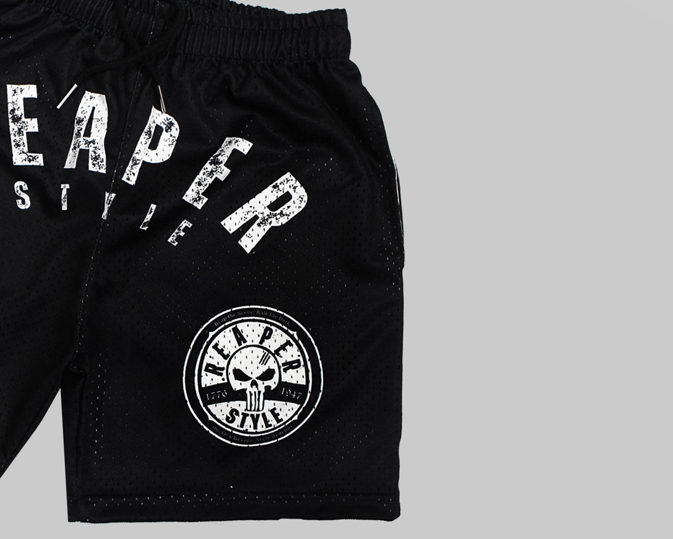 Reaper Style Black Mesh Shorts – Skull Badge Streetwear