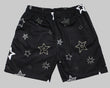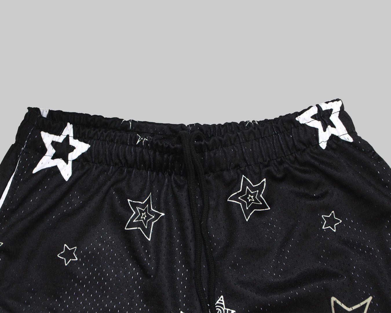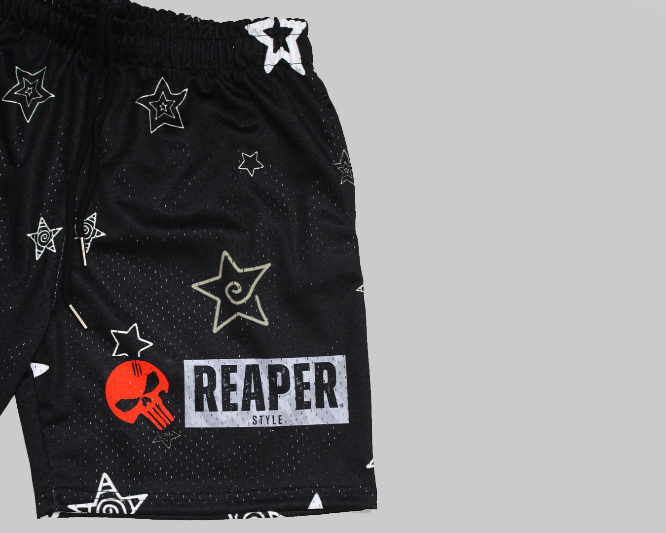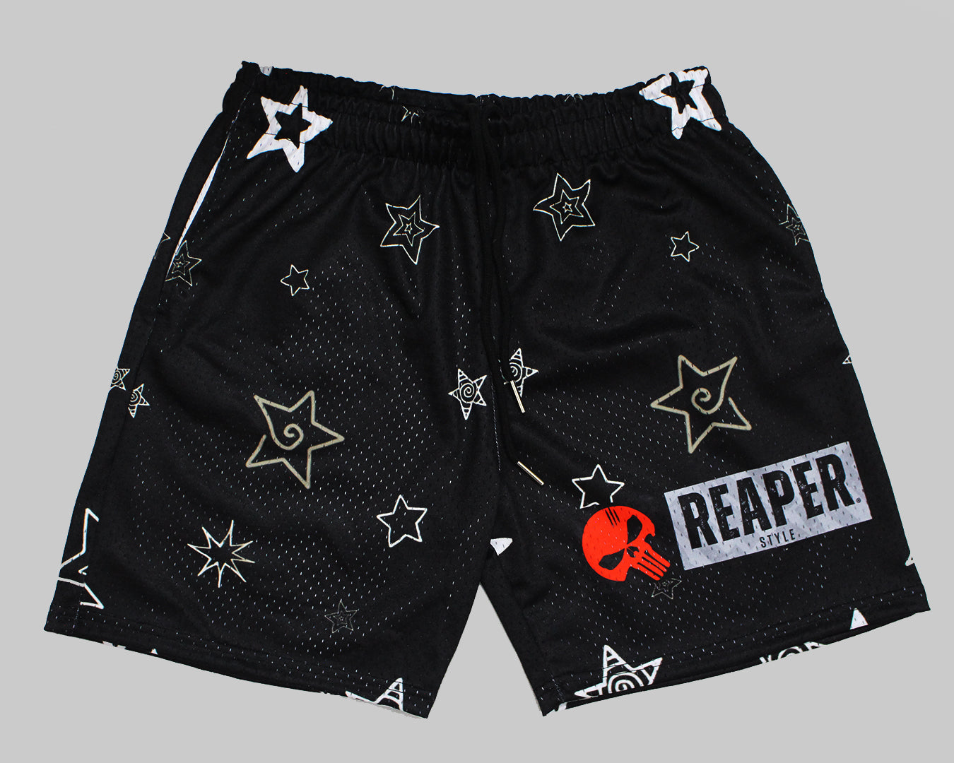 Step into the dark with these Reaper Black Star mesh shorts built for the bold. Designed in jet black with an all-over chaotic constellation of outlined stars, swirls, and abstract motifs, these shorts carry a cosmic streetwear energy.